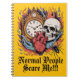 Celebrate your unique, beautifully weird side with this striking gothic illustration. A skeletal skull, realistic heart, and ornate clock are wrapped in flames, framed by bold gothic typography that reads “Normal People Scare Me!!!”
