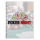Un carnet en spirale avec typographie de poker nocturne. Arrière - plan est une image faible avec des puces de poker et jouer aux cartes sur une table verte de jeu. Couché sur le dessus est un ensemble de 4 cartes avec silhouettes garçon et fille avec le texte : Poker Night. Écrit en gros caractères gras.