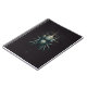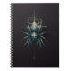 A spiral notebook featuring a detailed dark biomechanical spider design on the cover. The teal and black arachnid has a single golden eye, set against faint sacred geometry, occult symbols, and subtle paint splatters. Perfect for journaling, sketching, or school. An edgy, industrial, and gothic stationery accessory for dark fantasy fans.