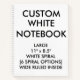Carnet d'images personnalisé LARGE ROUILLÉ avec SPIRAL BLANC (6 options de couleur) Modèle blanc - 8,5 po x 8,5 po (60 feuilles, 120 pages). Concevez, créez, créez les vôtres. Votre photo, image, texte, logo, graphiques en couleurs plastifiées, d'un bout à l'autre du bloc-notes, sur les couvertures avant et arrière du bloc-notes. papier lisse en texte durable, couvercles avant et arrière laminés, conforme CPSIA. OPTIONS DE FORME : Forme rectangulaire, Carré ou Coeur. OPTIONS DE COULEUR SPIRALE : Noir, Blanc, Gris, Rouge, Bleu ou Vert. OPTIONS DE CONCEPTION DE PAGE : Roulement général, Roulement collégial, Esquisse, Pratique, Esquisse/Pratique, Esquisse/Roulement étendu, Graphique ou Recette (En forme de coeur : Lined ou Plain seulement). Le meilleur pour l'école, le collège, la cuisine, le bureau, les notes et les idées, et pour les cadeaux d'anniversaire et de Noël.