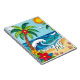 A coastal monogrammed notebook in a paper quilling style ai illustration of two palm trees, the sun, ocean waves, a beach and tropical flowers.