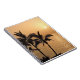 Des silhouettes de palmiers contre le ciel couché de soleil.