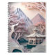 Un joli faux papier découpe paysage carnet de photo en spirale avec montagnes, pavillon et arbres.