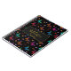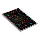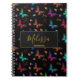 Un cahier personnalisé conçu avec un motif élégant comprenant une illustration graphique de papillons voltigeant dans de nombreuses couleurs vives, contrastant très joliment sur le fond noir. Des florales fantaisistes, des brindilles et des feuilles ajoutent un peu de charme. Un cadre noir avec une bordure dorée superposé avec votre texte personnalisé à l'intérieur.