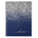 Parties scintillant à étincelles bleu marine et argent Nom du monogramme Planificateur de Carnets spiraux. Cela rend le cadeau parfait pour 16 ans, mariage, douche nuptiale, anniversaire, baby shower ou bachelorette pour quelqu'un qui aime le luxe glam et les styles chic.