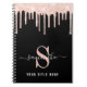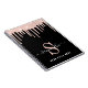 Carnet élégant personnalisé avec fausse parties scintillant rose qui coule du haut contre un arrière - plan noir. Ajoutez votre monogramme initial dans la typographie moderne rose et blanc, votre nom dans un script blanc design et tendance avec des swashes et un titre en option.