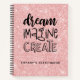 Ce carnet de croquis personnalisé 8,5 x 11 a du texte noir sur un arrière - plan en faux parties scintillant rose. Les mots "DREAM, IMAGINE, CREATE" dans une police dessinée à la main personnalisée avec votre nom ci-dessous. Customisez le carnet d'esquisses avec le nom de votre choix pour que quelqu'un se sente spécial. Fait un cadeau amusant pour les anniversaires ou pour Noël. Vient dans une variété de couleurs. Conçu pour vous par Blackberry Boulevard.