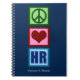 Carnet RH Peace Love en bleu foncé pour un gestionnaire des ressources humaines. Un signe de paix, un coeur, et un HR écrit en bleu. Customisez avec votre nom de représentant, votre entreprise ou votre entreprise sur ce joli cadeau monogramme.
