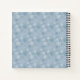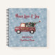 Un bloc-notes en forme de quare en spirale avec un petit camion de jouets mignon avec joyeux main Noël peint sur le côté. Le transport d'un sapin de Noël décoré à l'arrière. L'Arrière - plan est un motif de flocons de neige bleu et blanc qui ajoute une touche festive.