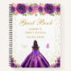 Cet élégant et glamour livre d'hôtes en sweet sixteen présente une belle princesse aux cheveux foncés et à la peau foncée dans une robe violette foncée. Le texte combine écriture manuscrite et polices sans serif modernes pour un look élégant et sophistiqué. Les compositions florales, les papillons et les confettis d'or créent un mélange parfait de rustique et de chic. Graphiques par www.etsy.com/uk/shop/SunflowerDayLove