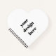 Style : Carnet spiral en forme de coeur Accessorise pendant que vous organisez avec ces carnets spiraux faits main. Les couvertures avant et arrière sont plastifiées et sont personnalisables avec vos images et textes. Choisissez parmi 4 styles de carnets, 6 couleurs de spirales et 2 types de pages pour créer un carnet entièrement unique. Dimensions : 8" l x 8" w Nombre de pages : 60 feuilles, 120 pages 60 lb. texte durable papier lisse Couvertures frontales et arrières laminées, blanc uni à l'intérieur Choix de 6 couleurs pour la spirale Choix de 2 designs pour les pages Conforme à la CPSIA Convient pour les âges 4+