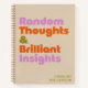 Libérez votre créativité avec ce carnet personnalisé, qui présente une typographie audacieuse et d'inspiration rétro qui déclare "Réflexions aléatoires et idées brillantes". Conçu avec un arrière - plan beige neutre et des touches vives de violet, d'orange et de vert, ce carnet est aussi design que fonctionnel. Que vous soyez en train d'étudier des idées, d'écrire votre prochain grand projet ou d'organiser vos pensées quotidiennes, ce carnet correspond à la tâche. Disponible avec des pages doublées, vierges, graphiques ou pointillées, il est parfait pour les étudiants, les professionnels et les esprits créatifs. Customisez le nom d'une touche personnelle et faites-en un cadeau réfléchi pour les écrivains, les penseurs ou toute personne qui aime la papeterie unique.