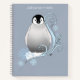 Une mignonne poussette de pingouin avec de la neige et des flocons de neige dans un décor gris bleu clair, le tout dessiné dans un style Art nouveau