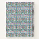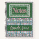 An intricate pattern of bright pink flowers with cheery green foliage and border by a smaller pattern and striped blue piping. The pink pronouncement, "Notes", is ornately framed with a green lace border.