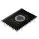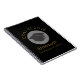 Un carnet en spirale qui dit Classe 20xx et le nom et l'école du diplômé, écrit en or. Conçu avec un capuchon de graduation noir entouré d'un cercle blanc semi-transparent. Arrière - plan noir avec lettrage or est simple mais élégant.