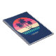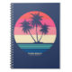 Ce design de plage présente la silhouette des palmiers contre un coucher de soleil rétro lumineux et le texte, "Zuma Beach, Californie."