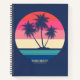 Ce design de plage présente la silhouette des palmiers contre un coucher de soleil rétro lumineux et le texte, "Zuma Beach, Californie."