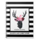 Un wedding planner de carnet en spirale (ou autre) personnalisé avec vos noms et le titre du sujet.Avec une tête de cerf noir faite de lignes géométriques et portant une couronne de fleurs roses. Design rustique et tendance. Arrière - plan est un motif à rayures blanches et noires.