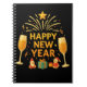 Celebrate the New Year with this warm golden festive illustration featuring Santa figures, gifts, shining stars, and elegant party elements. A bright and joyful design that adds a magical touch to every New Year celebration
