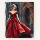 Una princesa majestuosa con un vestido de gala rojo se alza frente a un castillo imponente. Un diseño que evoca romance y fantasía.
