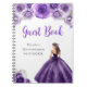 Ce livre d'hôtes de quinceanera présente une belle princesse dans une robe violette foncée aux arrangements floraux. C'est parfait pour une fête d'anniversaire de quinceanera.