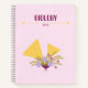 A purple and yellow notebook with a simple floral design of geometric flowers for school girls.