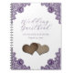 Elegant rustic purple wedding guest book spiral notebook featuring purple floral lace and two burlap hearts. Matching items available.