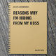 Carnet amusant pour les collègues de bureau, les gestionnaires, les amis de travail ou d'autres professionnels de l'administration et des affaires. Personnalisez le nom à imprimer en bas de la couverture "Raisons pour lesquelles je me cache de mon patron". Les carnets personnalisés sont parfaits pour les anniversaires de travail, les vacances, les échanges de cadeaux de bureau et plus encore!