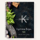 Un carnet pour un gourmet et vos recettes végétariennes préférées. Sur la couverture : nourriture fraîche, herbes, oignons de basilic, une planche à découper en bois, un hélico à base de plantes sur la toile rustique foncée d'un peintre avec des taches de peinture. Personnalisez et ajoutez votre monogramme initial, nom et texte. Le nom est écrit avec un script en lettres manuscrites tendance avec des swashes. Pour que les swashes ne suppriment que le nom de l'échantillon, laissez les espaces ou émoticônes devant et après le nom.
