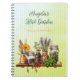 Cahier relié en spirale pour jardin de plantes aromatiques. Un étagère de pots contenant des herbes, des baies et des fleurs est représentée sur le design. Personnalisez le texte en écriture amusante en haut. Des bandes verticales bleu clair et vert constituent l'arrière-plan. Une bordure en volutes sépare le texte des pots de plantes aromatiques. Les pages lignées peuvent contenir des informations sur la plantation, la croissance et la récolte, ainsi que des remèdes et des thés à base de plantes aromatiques faits maison.