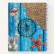 Une texture arrière - plan rustique de bois bleu, faux burlap, étoiles de mer orange, coquillage, corail blanc et boussole centrée sur le texte personnalisé. Un design nautique avec une touche moderne. Customisez le texte et faites-le vous-même.