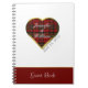 Carnet d'hôtes écossais chic à thème mariage, en blanc, avec un grand coeur doré encadré de plaid et un groupe rouge, en bas. Les noms de mariée et de mariée en blanc sont à l'intérieur du coeur plaid rouge, noir et jaune, avec un texte personnalisé supplémentaire à côté du coeur et sur la bande rouge du fond. Personnalisez tout le texte pour répondre à vos besoins mariages.
