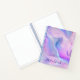Un arrière - plan holographique tendance en rose, violet, bleu. Personnalisez et ajoutez un nom, The title : sketchbook écrit avec un script de style à la main moderne et girly avec des swashes. Lettres violettes. Un carnet pour les dessins, esquisses, notes et devoirs scolaires. Pour que les swashes ne suppriment que le nom de l'échantillon, laissez les espaces ou émoticônes devant et après le nom.