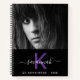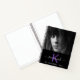 Un arrière - plan noir chic. Personnalisez et ajoutez votre propre photo, un nom, une lettre monogramme et une année. Le nom est écrit en blanc avec un grand script de style à la main moderne avec des swashes. La lettre monogramme en violet. Pour l'école, travaillez comme un carnet de croquis, un journal intime et un journal. Pour que les swashes ne suppriment que le nom de l'échantillon, laissez les espaces ou les émoticônes devant et après le nom