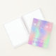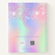 Un arrière - plan holographique branché aux couleurs pastel unicorne et arc-en-ciel rose, violet, or rose, vert menthe. Décoré avec de la poussière de parties scintillant en faux rose. Personnalisez et ajoutez un nom, The title : sketchbook écrit avec un script de style à la main moderne et girly avec des swashes. Lettres violettes. Un carnet pour les dessins, esquisses, notes et devoirs scolaires.
