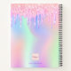 Un arrière - plan tendance aux couleurs irisées avec des couleurs pastel unicorne et arc-en-ciel rose, violet, or rose, vert menthe. Décoré avec des gouttes de parties scintillant en or rose et rose, la peinture goutte à goutte. Personnalisez et ajoutez un nom et une lettre monogramme. Le titre : Sketchbook est écrit avec de grandes lettres en caractères gras. Le nom est écrit avec un script de style moderne écrit à la main avec des swashes. Pour que les swashes ne suppriment que le nom de l'échantillon, laissez les espaces ou émoticônes devant et après le nom. Utilisez-le comme carnet d'esquisses, dessin, prise de notes, idées artisanales, école, travail à domicile.