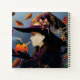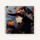 Jolie sorcière brune tout habillée en orange, violet et noir. Deux amis avec elle... une petite souris et un bébé citrouille qui la regardent de plus près. Les feuilles d'automne tombent tout autour d'eux.