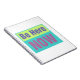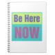 "Be Here Now" en bleu, rose. Jaune et Turquoise sur un journal ou un carnet bordé.