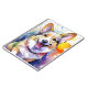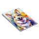 Une image art numérique d'un Corgi vibrant avec de grandes oreilles expressives et une expression joyeuse domine l'image, entourée de éclaboussures d'aquarelle colorée. L'arrière - plan présente des éclats dynamiques de bleu, jaune et orange, ajoutant une sensation ludique et énergique.
