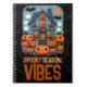 Fun Halloween Spooky Season Vibes notebook featuring a charming Halloween illustration showing a whimsical haunted house glowing with orange windows, surrounded by smiling pumpkins. Friendly ghosts float in the night sky while bats add a touch of spooky fun. The playful mix of spooky and adorable captures the joy of trick-or-treat season. A festive design for those who love light-hearted Halloween magic.