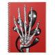 Carnet à main de squelette avec illustration graphique d'une main d'un squelette avec des fantômes éffrayants noirs aux yeux brillants tourbillonnant autour de lui sur un arrière - plan rouge profond personnalisable.