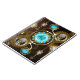Turquoise lenses with antique watch with brass gears and golden keys on rusty, brown background. Steampunk style.
