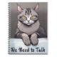 Carnet dans l'illustration d'un chat tabby gris à l'aspect sévère avec des yeux jaunes piercing reposant ses pattes avant sur une corniche, regardant directement en avant avec un air d'autorité sérieuse. Sous le chat, un script gras dit : "Nous avons besoin de parler", ajoutant humour et drame.