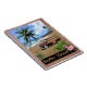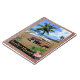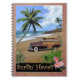 Belle photo de style rétro, montrant une voiture plus ancienne avec planches de surf sur la plage, entourée de végétation tropicale. Texte "Surfin' Hawaii".