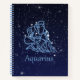 Carnet de bord en spirale avec le symbole d'Aquarius en bleu argenté doux, recouvert des étoiles de la constellation, contre un arrière - plan ciel étoilé classé de bleu nuit profond à noir.
