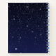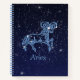 Carnet spiral avec le symbole pour Aries en bleu argenté doux, recouvert d'étoiles de la constellation, contre un arrière - plan ciel étoilé, classé du bleu profond de minuit au noir.