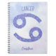 Ce joli carnet de Cancer de la lavande et du violet personnalisé présente votre signe astrologique du Zodiac dans un beau éclat comme les constellations. Customisez ce cadeau mignon avec votre nom dans une belle écriture cursive pour quelqu'un qui a un anniversaire fin juin ou début juillet.