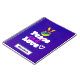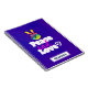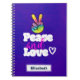 Un cool funky carnet spiral personnalisé avec paix et amour écrit dans une police de typographie super. L'illustration est un symbole de paix en forme de main, les doigts soulevés dans le signe v classique, tous faits en couleurs arc-en-ciel. Un petit coeur de gribouillis à côté du mot amour. Design super psychédélique. Arrière - plan violet acide.