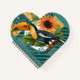 L'image montre un grand tucan avec un bec orange rayonnant qui est fier d'une branche. Entouré de pétales verts et d'une fleur solaire lumineuse, il émet une chaleur pacifique et exotique. Les couleurs vivantes et le design patchwork donnent un sens de l'attachement à la nature et de la sérénité.