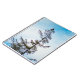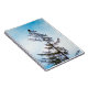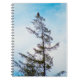 Une photographie d'un pygargue à tête blanche perché au sommet d'un grand pin. Un ciel bleu avec des nuages brumeux est à l'arrière-plan. Des traces de soleil et de neige peuvent être trouvées sur l'arbre et ses branches.